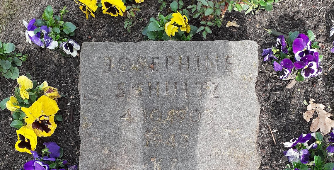 Der Grabstein von Josephine Schultz liegt heute auf dem Friedhof Tonndorf, vor der Kriegsgräberstätte für die Bombenopfer der Angriffe von 1943.