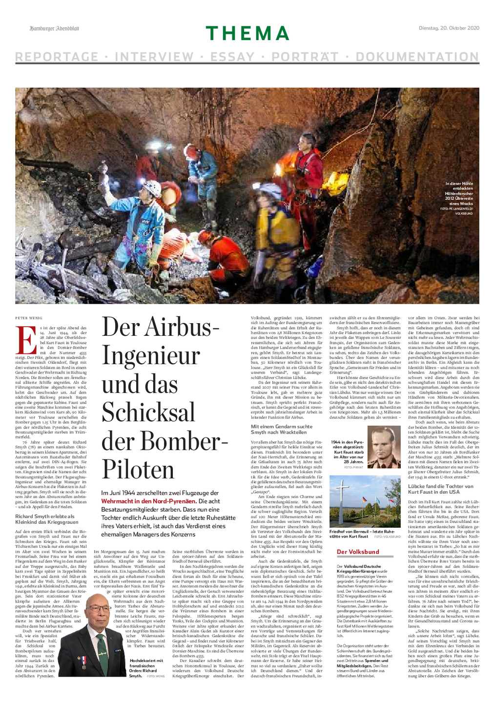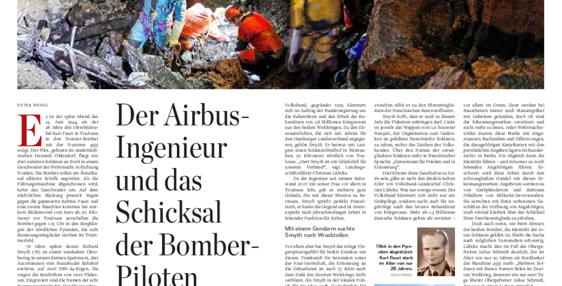 Mit freundlicher Genehmigung des Hamburger Abendblattes stellt die Landesgeschäftsstelle Hamburg Ihnen den Artikel des Journalisten Peter Wenig zur Verfügung. Dieser Artikel beschreibt die Bemühungen des Hamburger Volksbund-Ehrenmitgliedes, Herrn Richard Smyth, der die Errichtung einer Gedenkstätte für die Besatzung eines Bomber-Flugzeuges aus dem Zweiten Weltkrieg in den französischen Pyrenäen auf eigene Faust vorantreibt. - Herzlichen Dank, Herr Smyth!